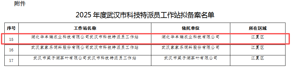 武汉市科技创新局正式公示2025年度武汉市科技特派员工作站拟备案名单,湖北华丰瑞农业科技有限公司凭借在智慧农业领域的深厚技术积累,以及在产学研协同创新方面的扎实实践成效,成功入选并获批设立科技特派员工作站。